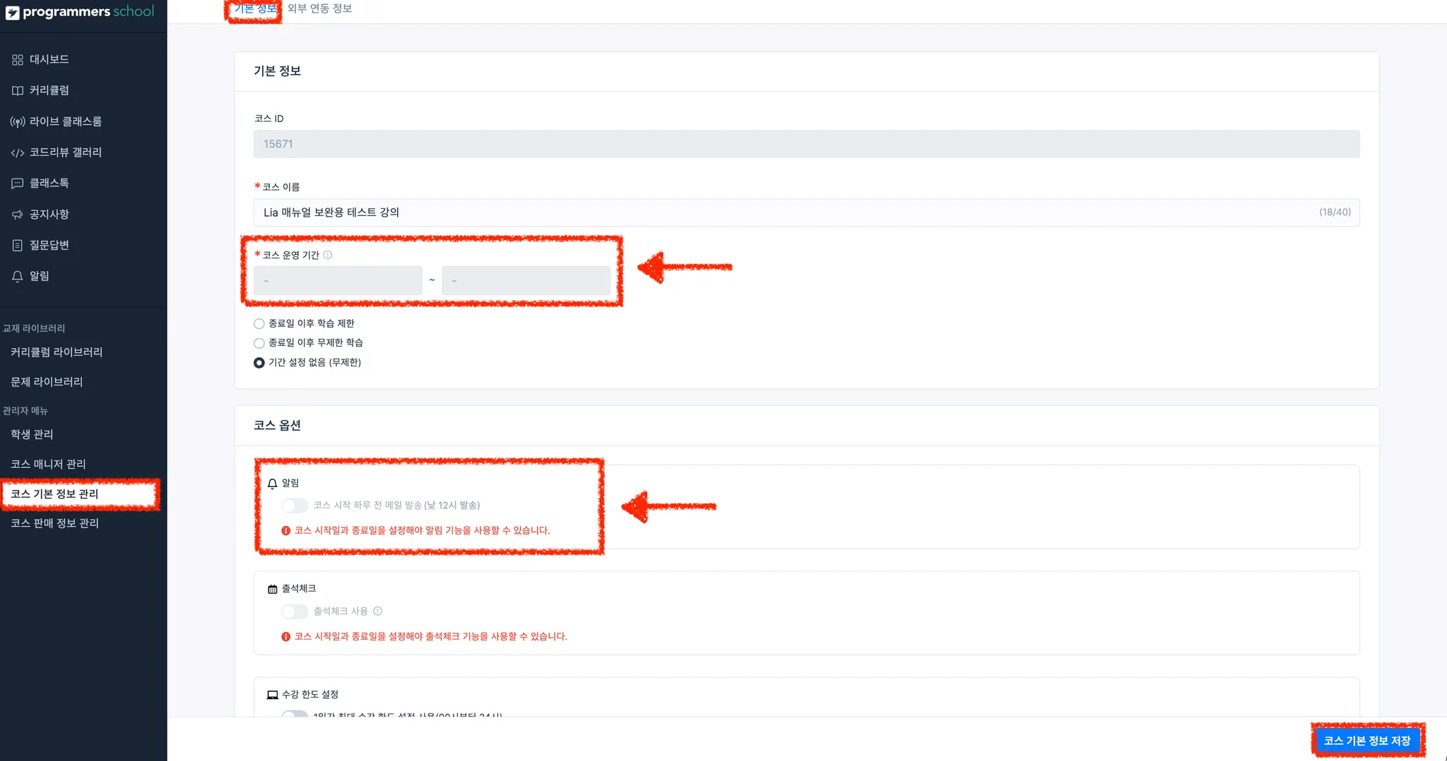 자동 강의 시작 안내 메일 발송을 이용할 경우 코스 운영 기간 등록이 필요합니다.