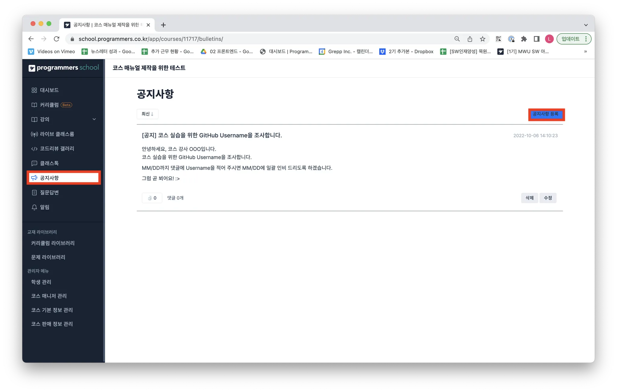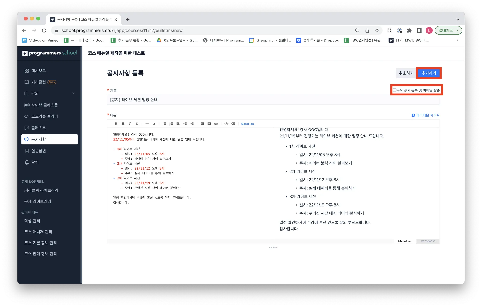 주요 공지로 설정할 경우 과정 수강자들에게 자동으로 이메일이 발송됩니다.