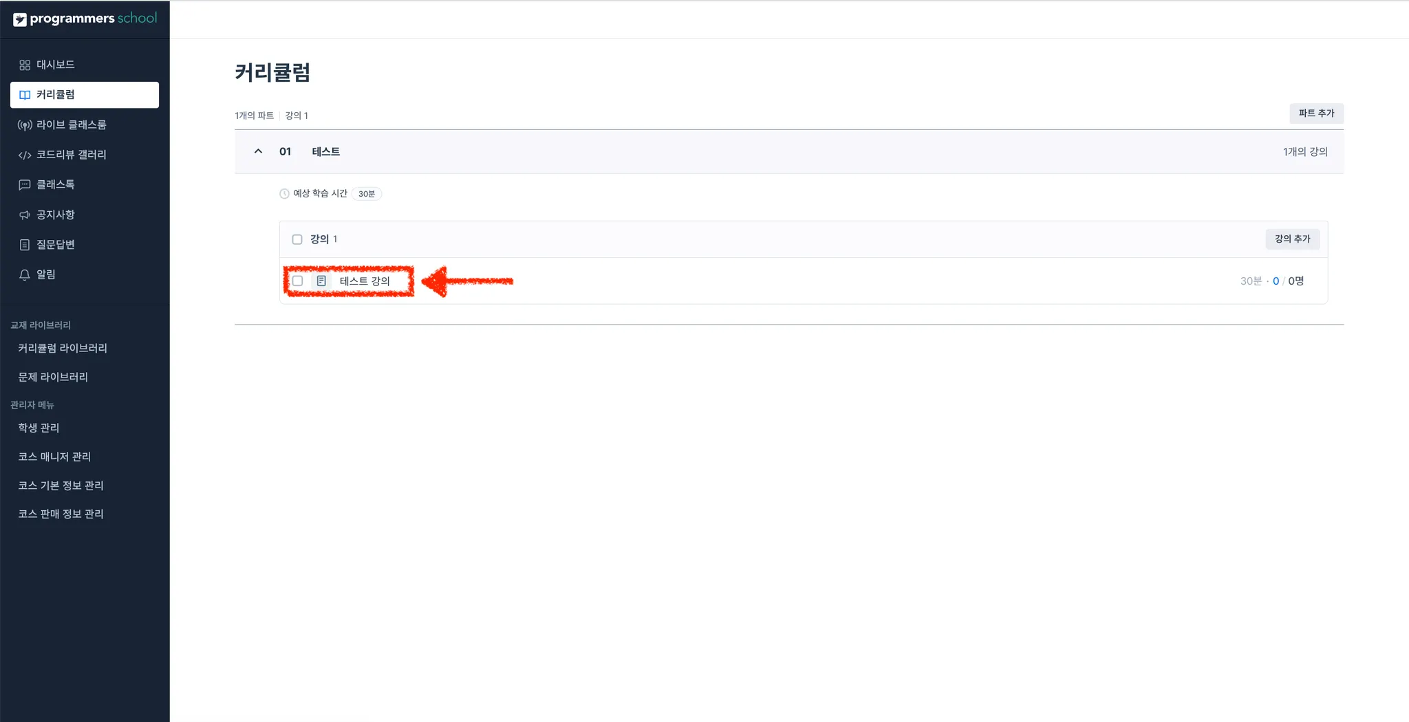 강의가 정상적으로 등록된 것을 확인합니다.