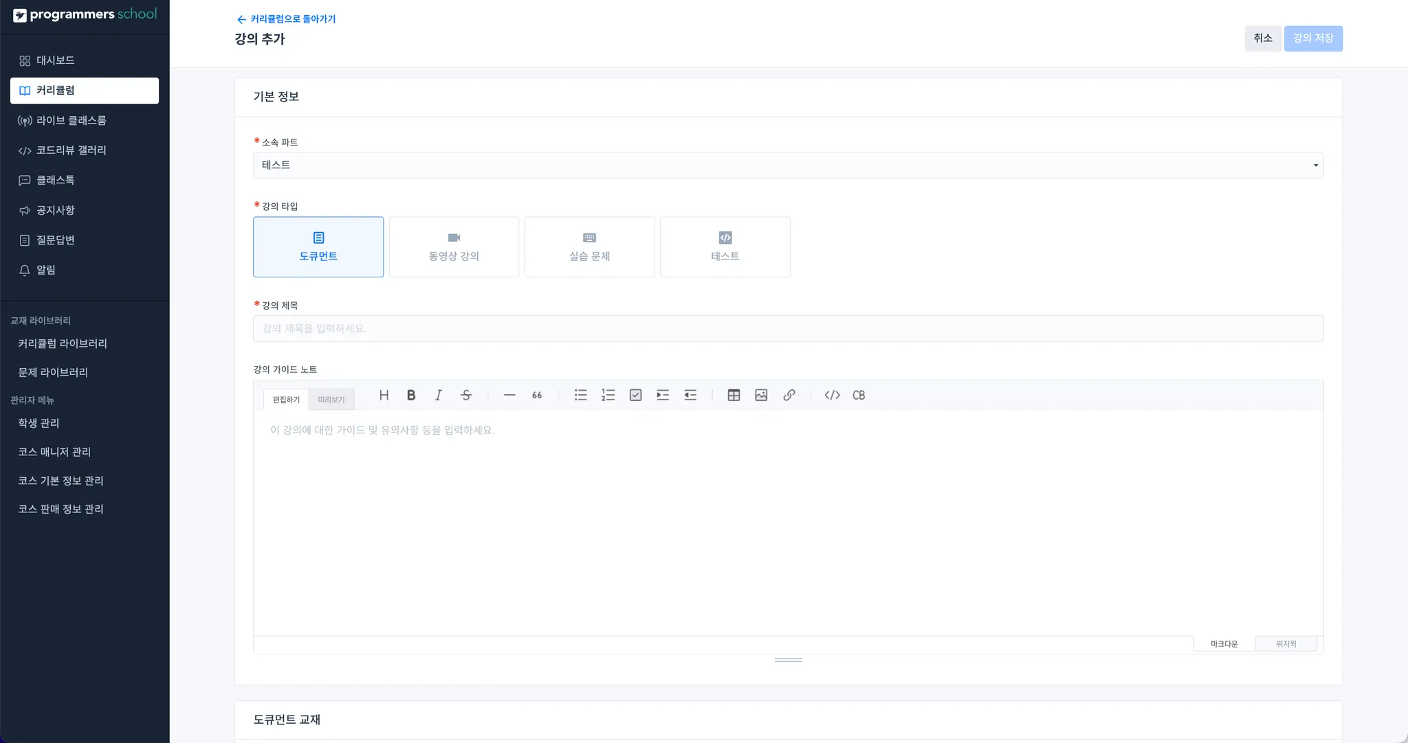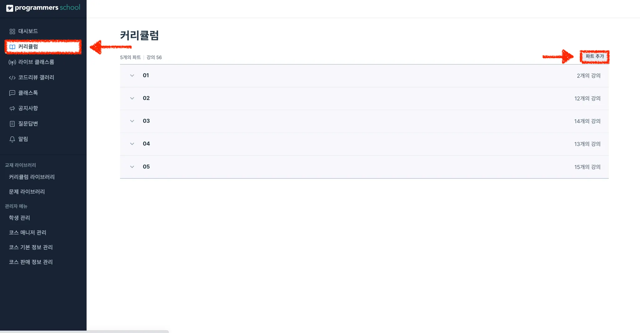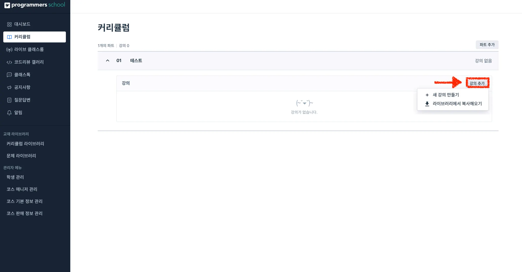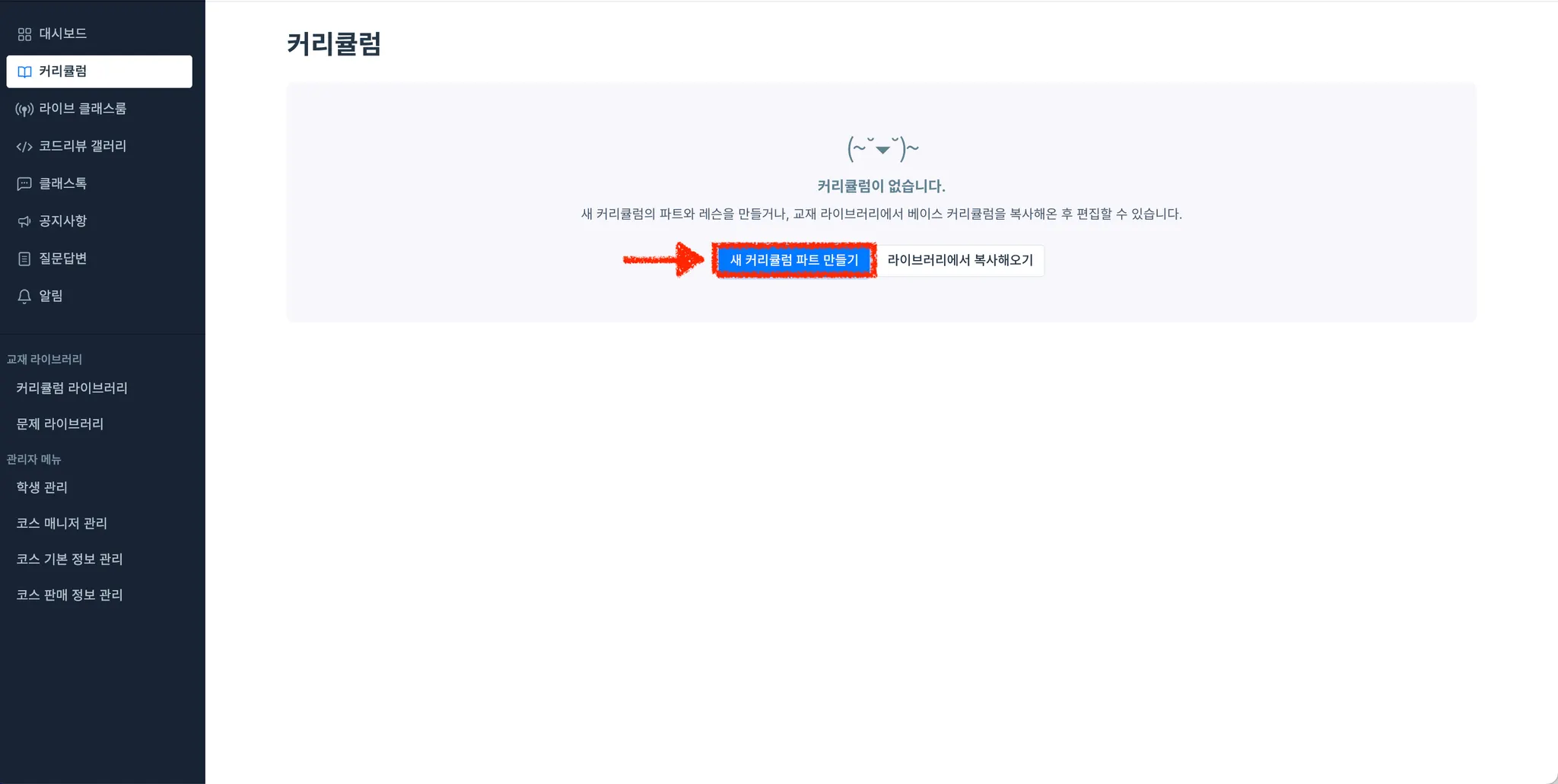 커리큘럼이 없을 경우, 새 커리큘럼 파트 만들기 버튼을 눌러 파트를 생성합니다.
