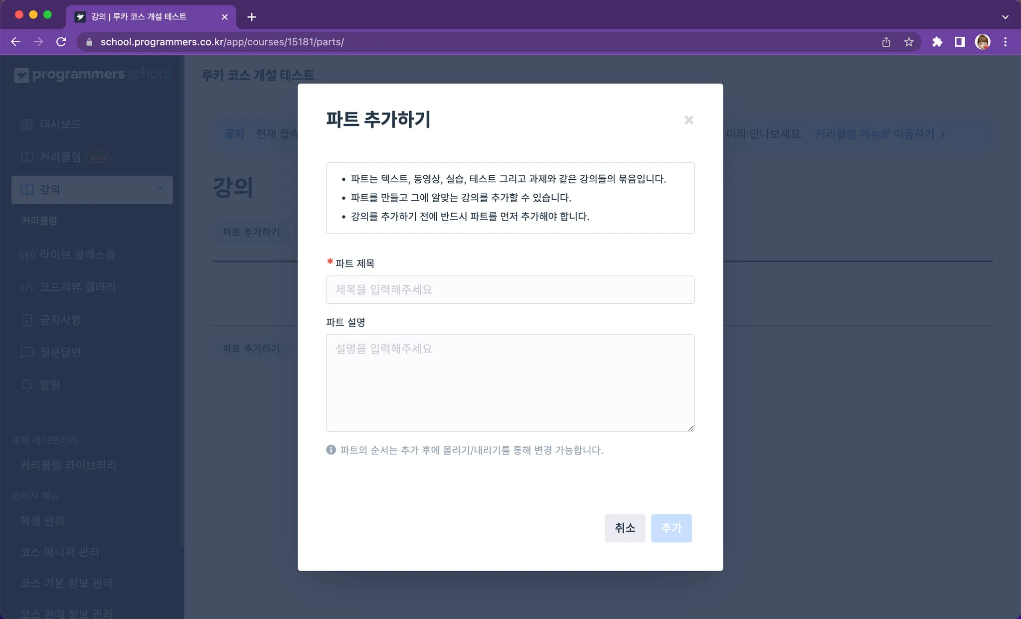생성한 파트의 강의 추가 버튼을 클릭하고 + 새 강의 만들기 버튼을 클릭하여 강의 추가 페이지로 이동합니다.