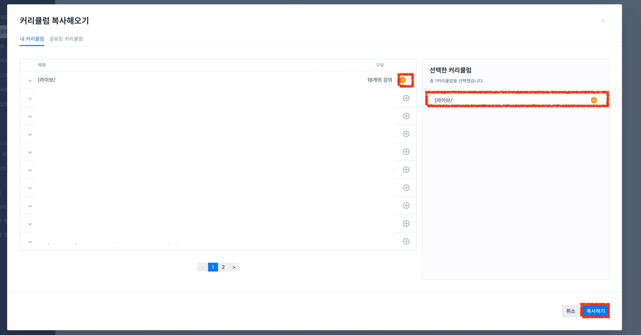 커리큘럼 목록 중 복사(이전 기수)하고자 하는 커리큘럼을 확인하신 후 + 버튼을 눌러 우측 하단 [복사하기]를 클릭합니다.