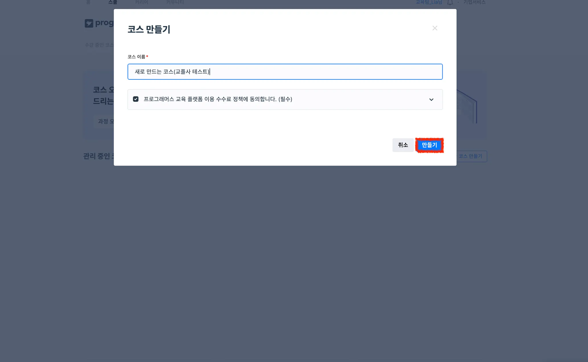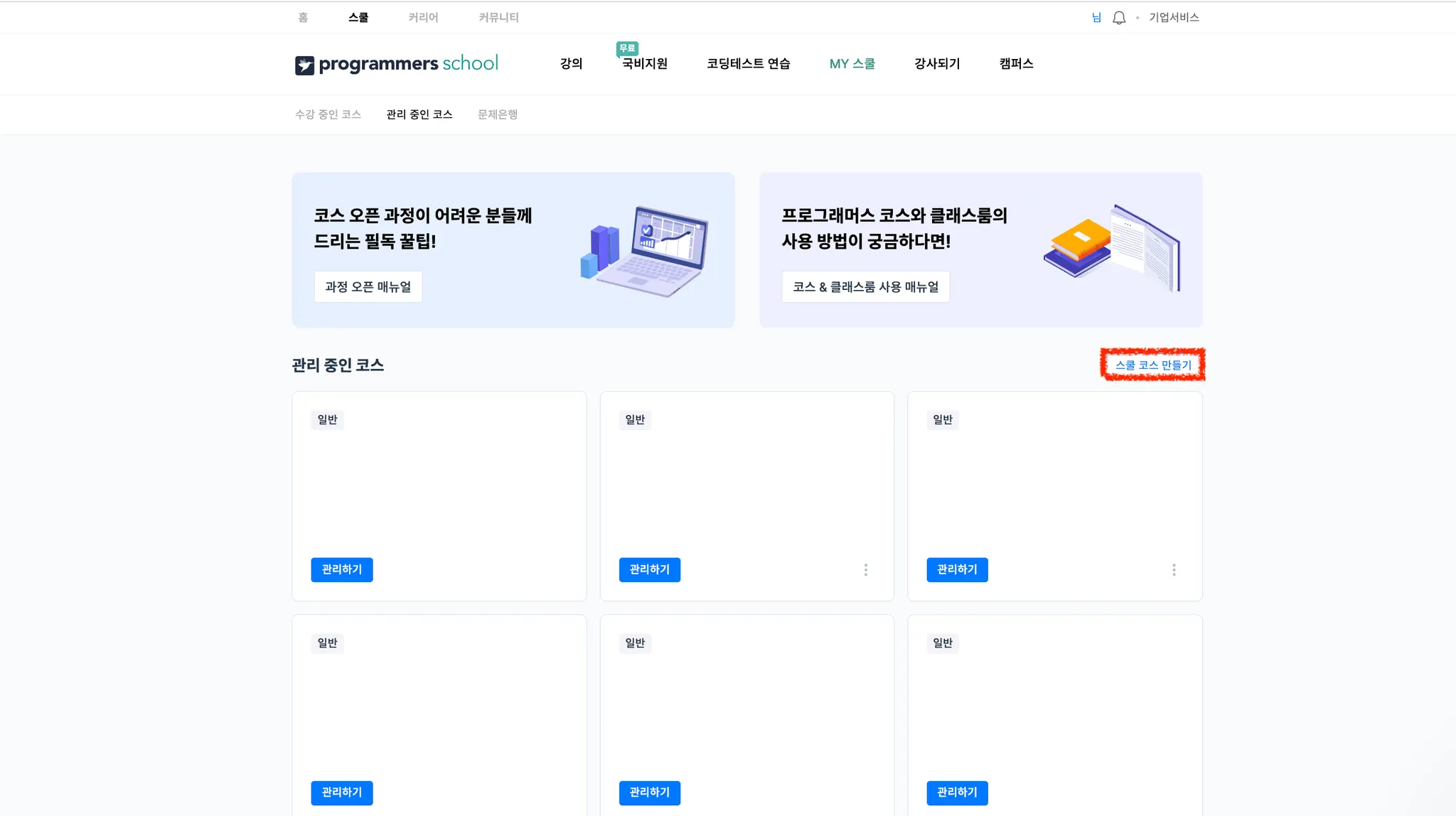 [스쿨 > MY 스쿨 > 스쿨 코스 만들기]를 클릭하여 스쿨 페이지를 생성합니다.
