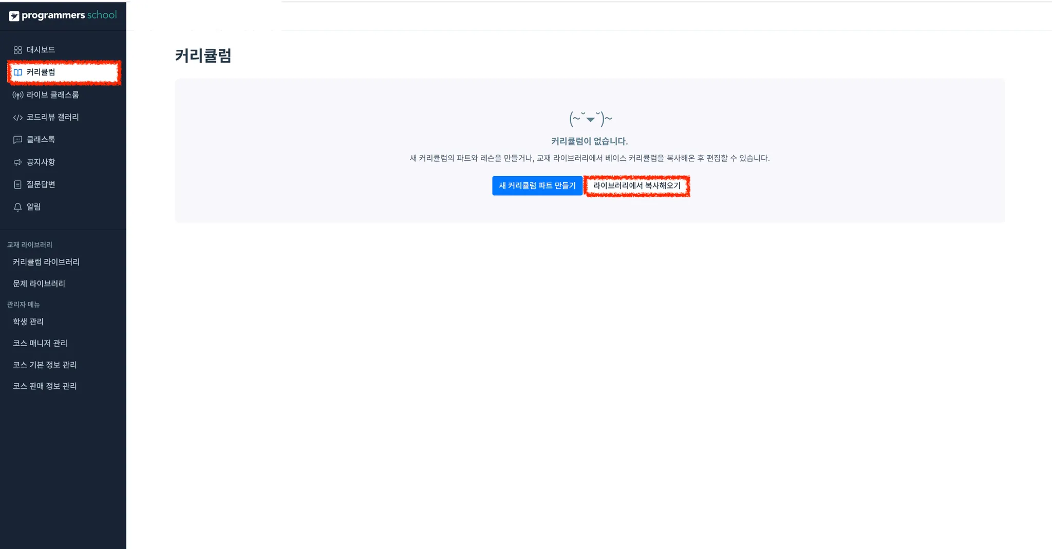 스쿨이 생성되었다면 좌측 메뉴 [커리큘럼] 클릭 후 [라이브러리에서 복사해오기]를 클릭합니다.